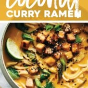 Coconut Curry Ramen with a creamy golden broth, pan-fried vegetables, cubes of golden brown tofu, and steamy delicious ramen noodles. Bonus: it’s vegan!