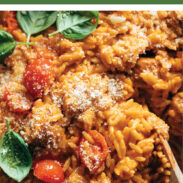 Roasty tomatoes, creamy parmesan orzo, and some meatballs if you want, all laced with a little bit of garlic butter. This is silky, luscious, and dangerously easy to eat. One bowl becomes two bowls becomes three… it’s so good. Plus, the whole thing gets mixed and baked all in one dish, which is the only way I want to live from here on out.